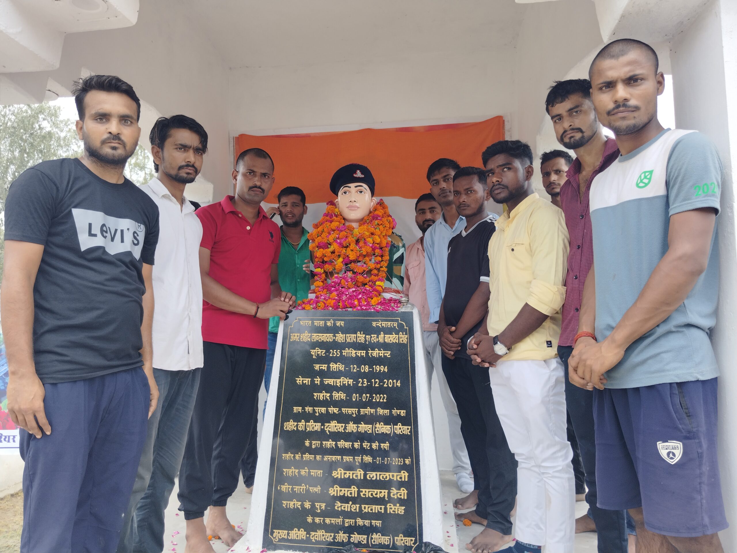 परसपुर , गोंडा : विकास खंड परसपुर के ग्राम गंगा पुरवा में अमर शहीद लांस नायक महेश प्रताप सिंह की द्वितीय पुण्यतिथि के अवसर पर सोमवार को उनकी प्रतिमा पर श्रद्धांजलि अर्पित की गई। सर्वप्रथम लांस नायक शहीद महेश की धर्मपत्नी सत्यम देवी, माता लालपति देवी एवं बेटा देवांश प्रताप सिंह ने गोण्डा से आए हुए भूतपूर्व सैनिक शिव बचन यादव हवलदार और गिरीश कुमार सिंह नायक के साथ अमर शहीद की प्रतिमा पर फूल-माला अर्पित कर उन्हें श्रद्धांजलि दी। इस अवसर पर वहां उपस्थित क्षेत्रीय जनों ने भी शहीद की प्रतिमा पर श्रद्धांजलि अर्पित करते हुए नमन किया और उनकी वीरता को याद किया।